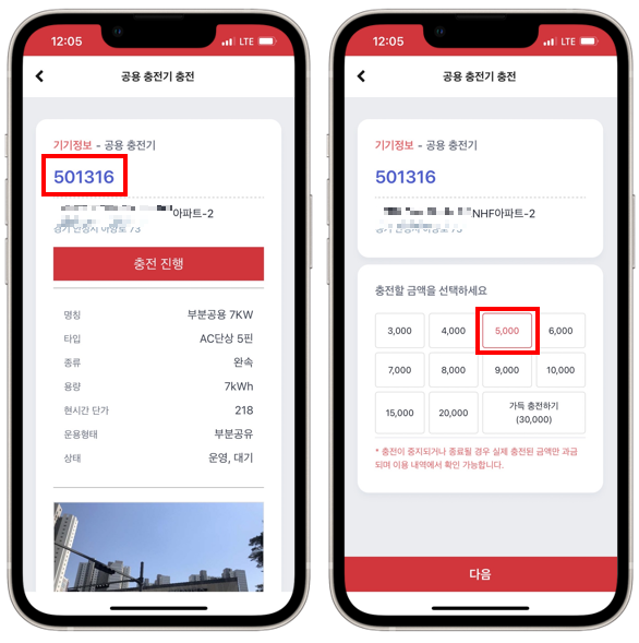 올바르게 표시되었는지 확인을 하고 [충전 진행] 버튼을 눌러 진행합니다. 이 때 충전할 금액을 선택해야 하는데, 저는 보통 집에서 이동형 충전기로 하면 만땅 채우는데 1500원 정도이나 장소마다 가격이 제각각이라 여유있게 5,000원을 체크하고 충전했습니다.