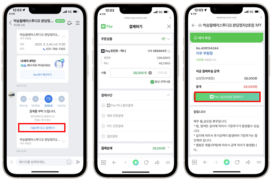 여기에서 [시술내역 보고 결제하기]를 누르면 최종적으로 4만원이 아닌 2만8천원이 청구된 것을 볼 수 있고 여기서 네이버페이로 결제하면 사전에 연동 설정한 네이버페이 결제수단으로 바로 결제가 됩니다. 그리고 결제가 됐다는 화면을 카운터 직원에게 보여주기만 하면 모든 결제 과정이 끝이납니다.