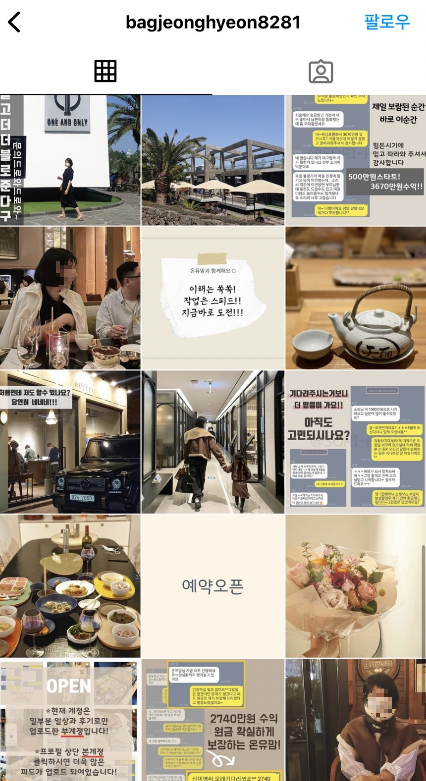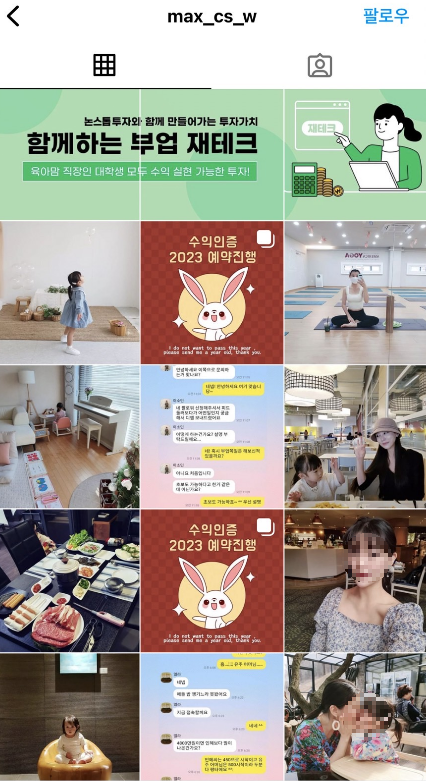 모두들 한결같이 어디선가 도용해온 사진을 올리고 물질적으로 풍족한 아이 엄마 코스프레를 한 가짜 계정들인데 여기에는 하나같이 재테크, 부업, 알바 등 돈과 관련된 계정들입니다.
