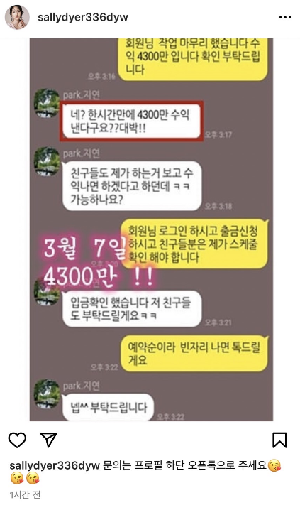 이 사람이 뭔가 리드를 해주고 그걸 따라만 했는데 하루에 적게는 수백만원, 많게는 수천만원을 쉽게 벌었다는 것을 인증하는 대화내역입니다. 모두 조작된 거짓 대화내용일 것이 100% 이겠지만 누군가는 여기에 낚이고 있으니 이런 스팸이 버젓이 활동하는게 아닐까 싶습니다.
