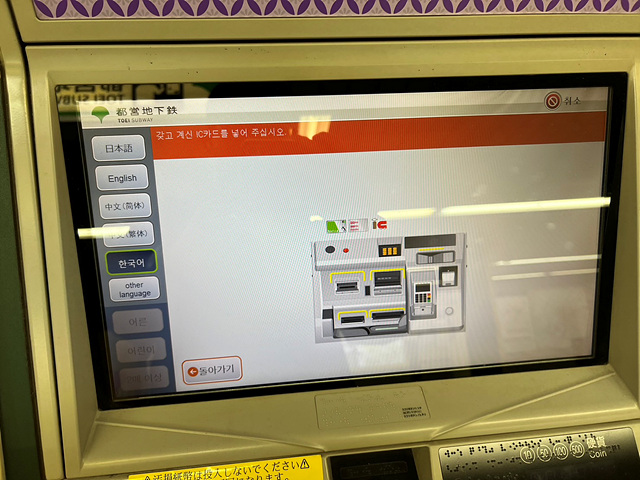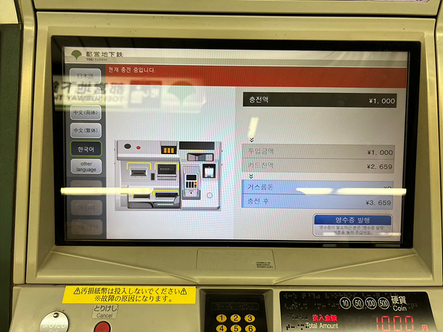 원한다면 영수증을 발행할 수도 있구요. 충전이 끝나면 맨 처음 삽입했던 IC카드가 나옵니다. 이제 카드에 돈이 충전된 것이고, 지하철 개찰구로 들어갈 때 해당 카드를 IC카드 인식 영역에 살짝 대기만 하면 "삐" 소리가 나면서 들어갈 수 있게 됩니다. 이것은 우리나라와 거의 비슷합니다.