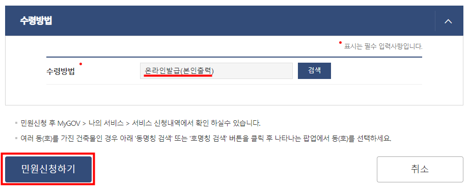 입력을 마치고 화면을 맨 아래로 내린 후 수령방법을 지정해줘야 하는데 우리는 온라인발급을 통해 프린터할 예정이니 온라인발급(본인출력)을 설정해주면 됩니다. 이후 화면을 아래로 내려 [민원 신청하기] 버튼을 클릭하면 모든 신청절차가 끝납니다.