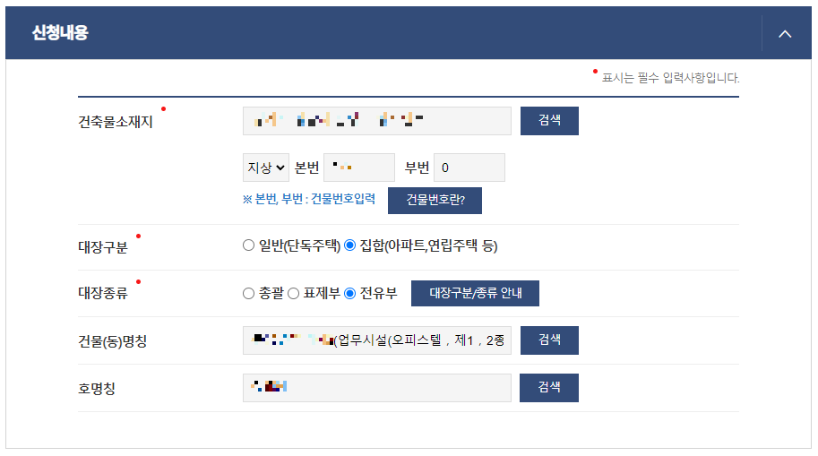 이후 건물(동) 명칭과 내가 조회하려는 부동산의 동호수 등을 검색해 입력합니다.