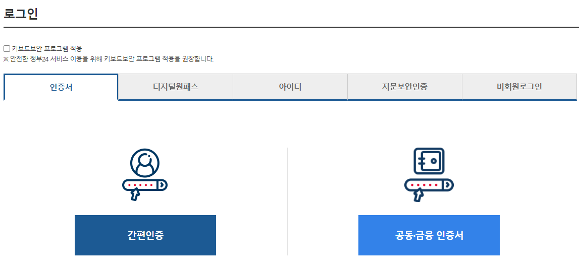 로그인 하는 방법은 인증서, 디지털원패스, 아이디, 지문보안인증 등 다양한 형태로 진행 가능한데, 가장 일반적인 방법은 인증서입니다. 간편인증 또는 공동/금융인증서를 활용하면 되는데 요새 네이버인증서나 카카오인증서 등이 편리하게 잘 구성되어 있으니 자신에게 가장 편한 방법을 선택해 진행하면 됩니다.
