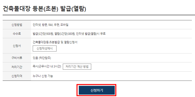 위 링크를 클릭하면 건축물대장 등본(초본) 발급(열람) 페이지로 들어가게 되고 하단에 [신청하기] 버튼을 클릭해줍니다.