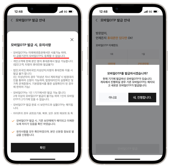 하단에 [모바일OTP 발급]을 누르면 유의사항에 대한 내용이 팝업으로 뜨는데요.