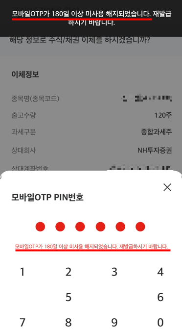 그런데 오랜만에 OTP 비밀번호를 입력했는데, 재발급을 받으라는 안내가 뜨더군요.