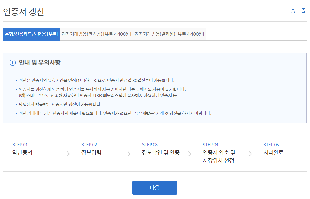인증서 갱신 페이지로 들어오면 상단 탭에 인증서 종류를 선택하는 부분이 있는데요.
