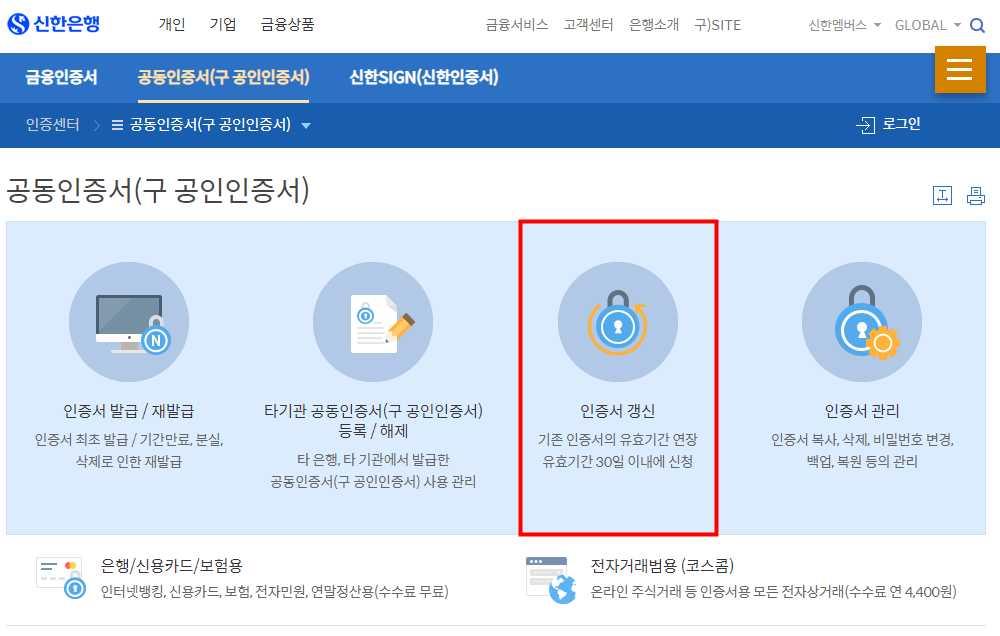 그리고 인증센터로 들어가 상단탭에 공동인증서(구 공인인증서) 메뉴에 접속하고, 중앙에 '인증서 갱신'을 클릭합니다.