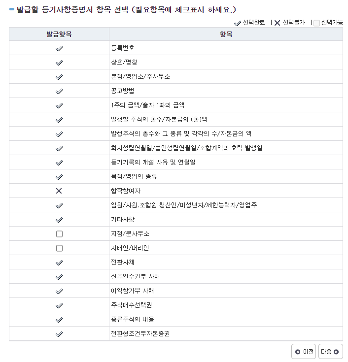 이제 발급할 등기사항증명서에서 항목을 설정하면 되는데요.