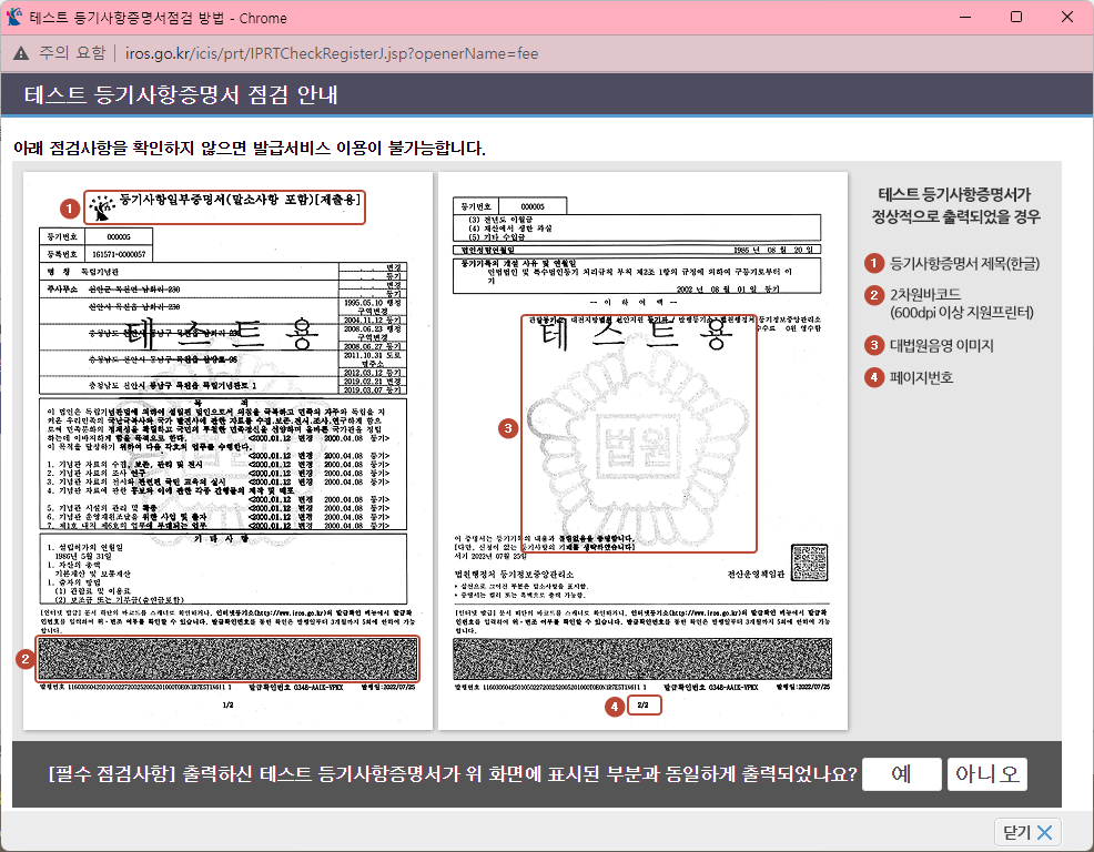 그래서 대법원 등기소에서는 테스트 점검을 할 수 있는 절차를 두어 제대로 출력되는지 우선적으로 확인토록 합니다.