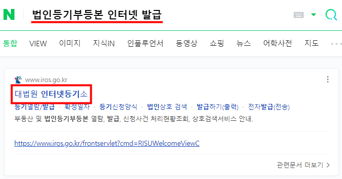 아니면 네이버에서 "법인등기부등본 인터넷 발급" 이라고 검색하셔도 쉽게 찾으실 수 있습니다.
