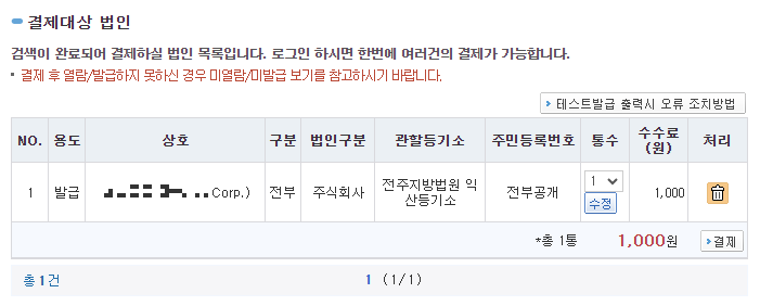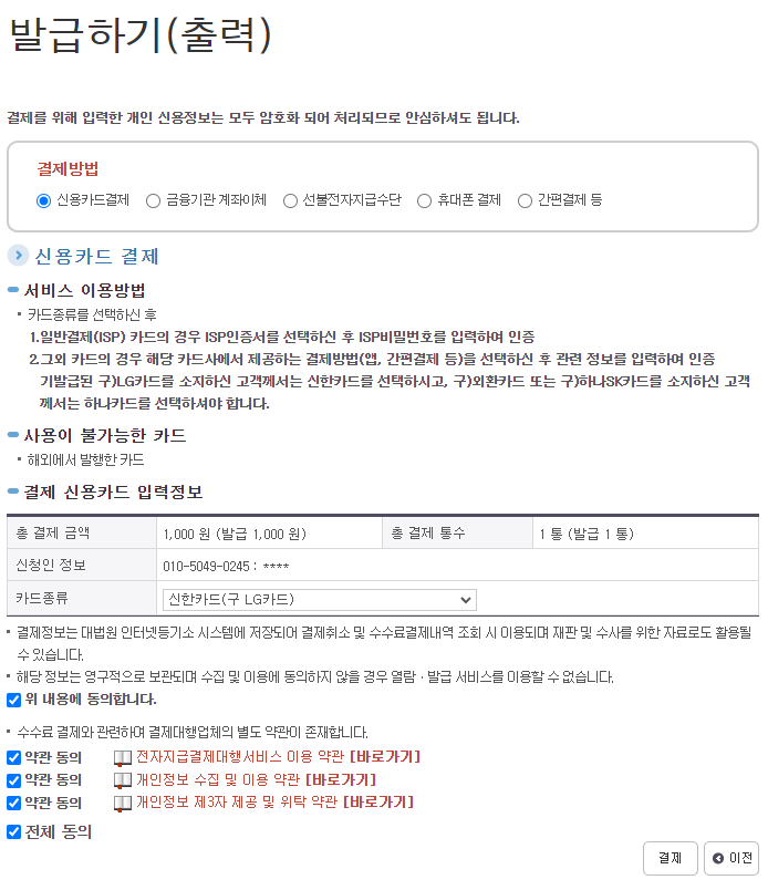 수수료는 1,000원이 발생하는데요. 우측 하단에 [결제] 버튼을 눌러 발급을 진행합니다.