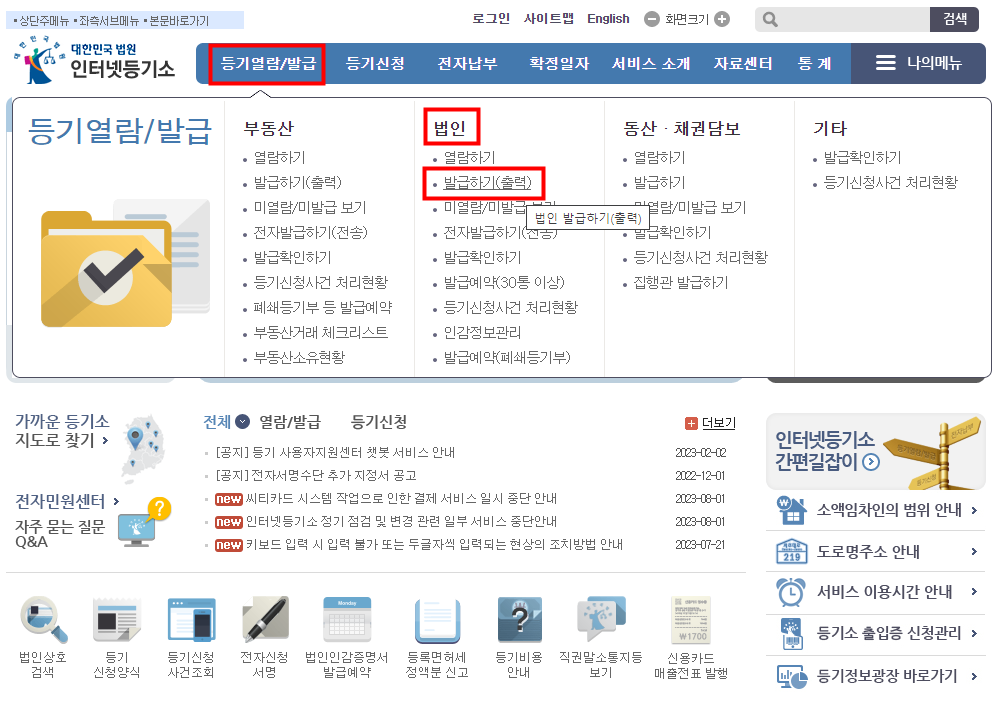 그렇게 사이트에 접속하면 메인화면 상단 메뉴에서 [등기열람/발급] 메뉴를 선택하여 법인 > 발급하기(출력)을 클릭해줍니다.