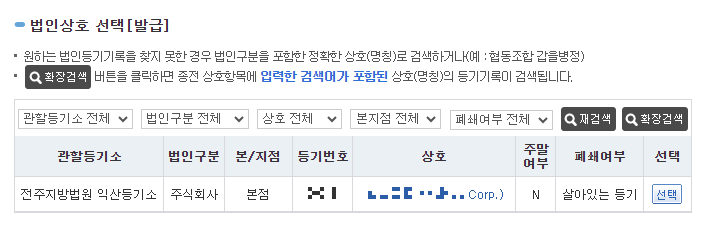 그렇게 조회된 결과 중 자신이 조회할 법인 목록이 뜨면 조회결과 우측란에 [선택] 버튼을 클릭합니다.
