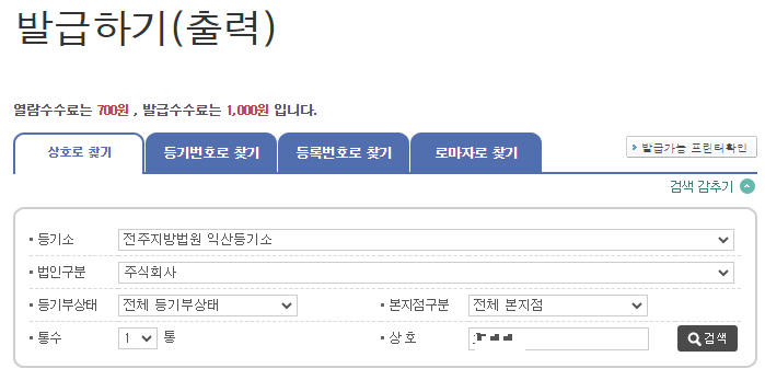 아래 화면처럼 관할 등기소, 법인 구분 등 옵션을 선택하고, 마지막으로 상호명에 법인명을 입력하여 [검색] 합니다.