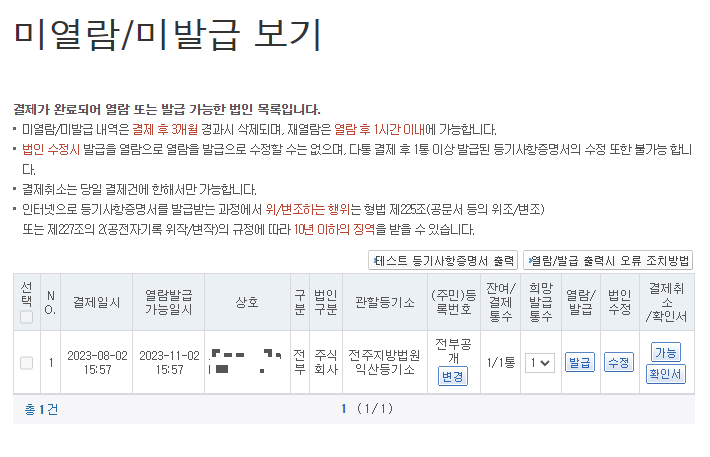 그렇게 결제가 완료되면 아래와 같은 화면이 나오며, 열람/발급 항목에서 [발급] 버튼을 눌러 인쇄를 진행해줍니다.