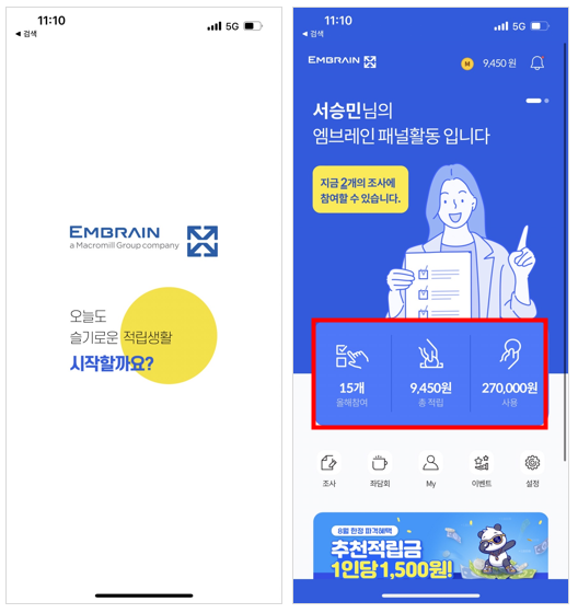 엠브레인은 설문조사 전문업체인데 저는 과거 직장 업무로 인해 이 업체에 설문조사를 의뢰한 경험이 있어 친숙한 곳이기도 합니다. 여기에서는 전국에 있는 패널들에게 설문조사를 요청하고 그에 따른 리워드를 지급하고 있는데, 패널로 등록을 하면 설문조사에 참여해 리워드를 받을 수 있습니다. 저는 그동안 27만원 정도를 쌓았고, 현금화까지 했습니다. 여기서 쌓인 돈은 현금으로 인출이 가능합니다.