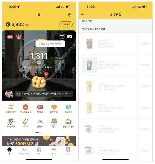 캐시워크는 100보에 1원으로 계산해 하루 최대 1만보까지 계산해 100원을 지급해줍니다. 저는 엘레베이터를 타는 시간, 잠자리에 눕는 시간, 화장실 가는 시간 등 멍하니 버려지는 시간을 틈틈히 활용해 클릭을 해주어 리워드를 받습니다. 그렇게 그동안 공짜로 먹은 커피와 음료가 상당합니다.