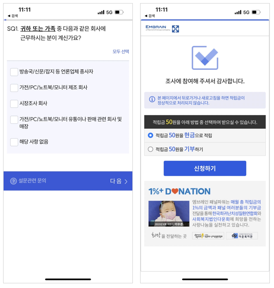 여러가지 문항에 대해 객관식 또는 주관식으로 답변하면 되고, 만일 원하는 조사대상이 아닌 경우에는 설문이 종료되며 소정의 금액만 지급이 됩니다.