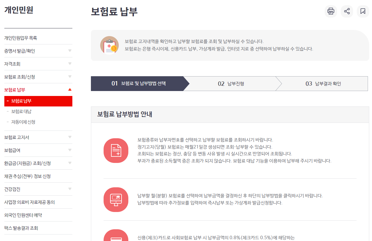 보험료 납부 > 보험료 납부 메뉴를 선택하면 보험료 조회 및 납부 방법을 선택해서 진행할 수 있습니다.