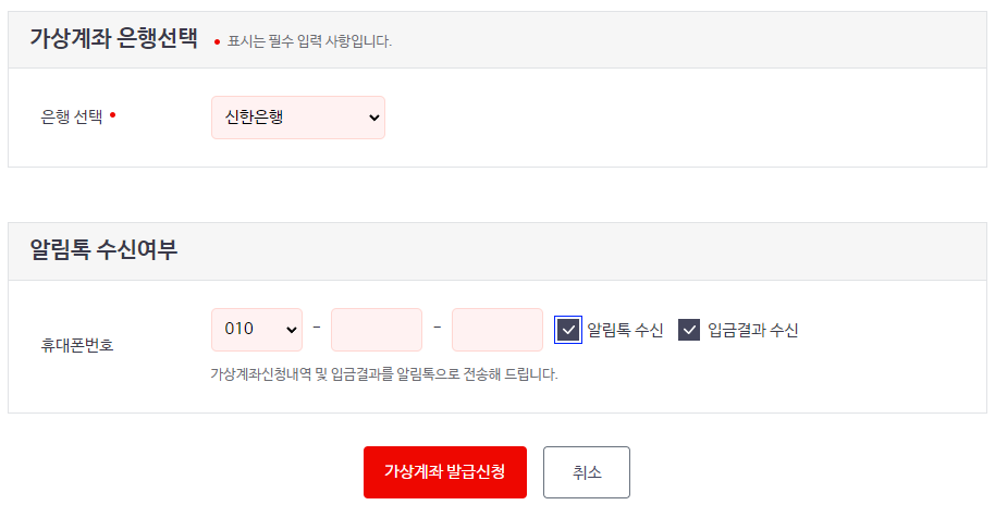 가상계좌 발급을 신청한 경우에는 아래처럼 은행을 선택하고 알림톡 수신여부를 설정합니다.
