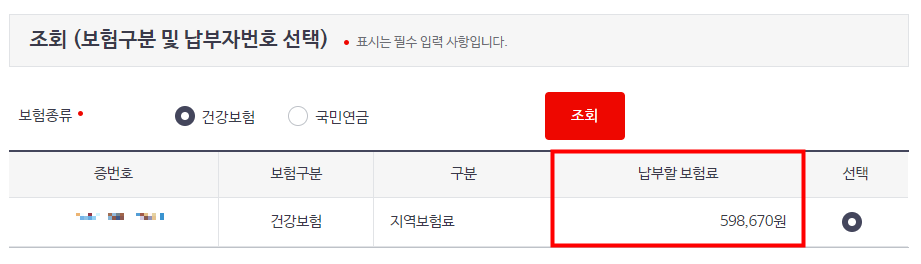 보험종료에 건강보험을 선택하고 [조회] 버튼을 누르면 납부해야 할 보험료가 나옵니다.
