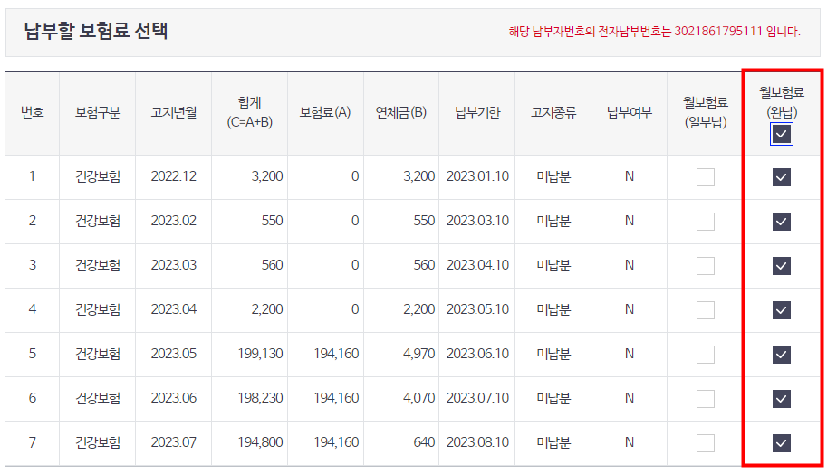 일단 납부할 대상을 선택해야 하는데 저는 모두 완납할 것이기 때문에 맨우측 체크박스를 모두 체크합니다.