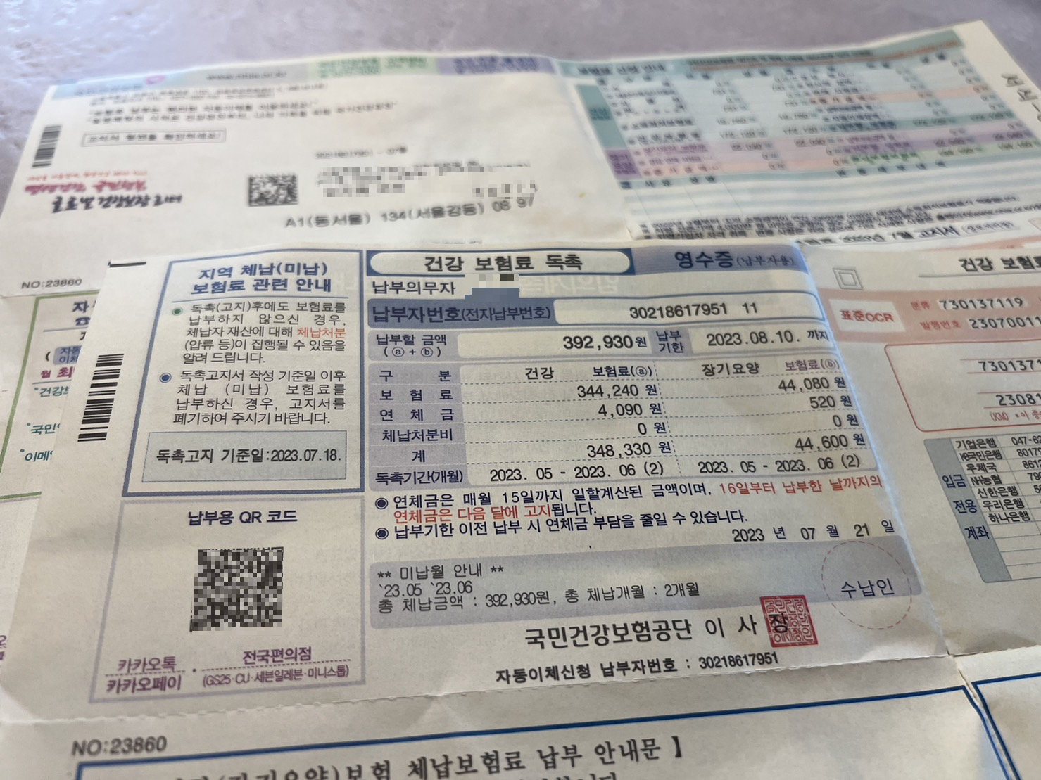 그동안 와이프 명의의 건강보험료 고지서를 받았지만 제것이 아니다보니 신경을 못써 몇 달 납부하지 못했더니 건강 보험료 독촉 고지서가 날라왔더군요. 당연히 연체금도 붙게 되었습니다.