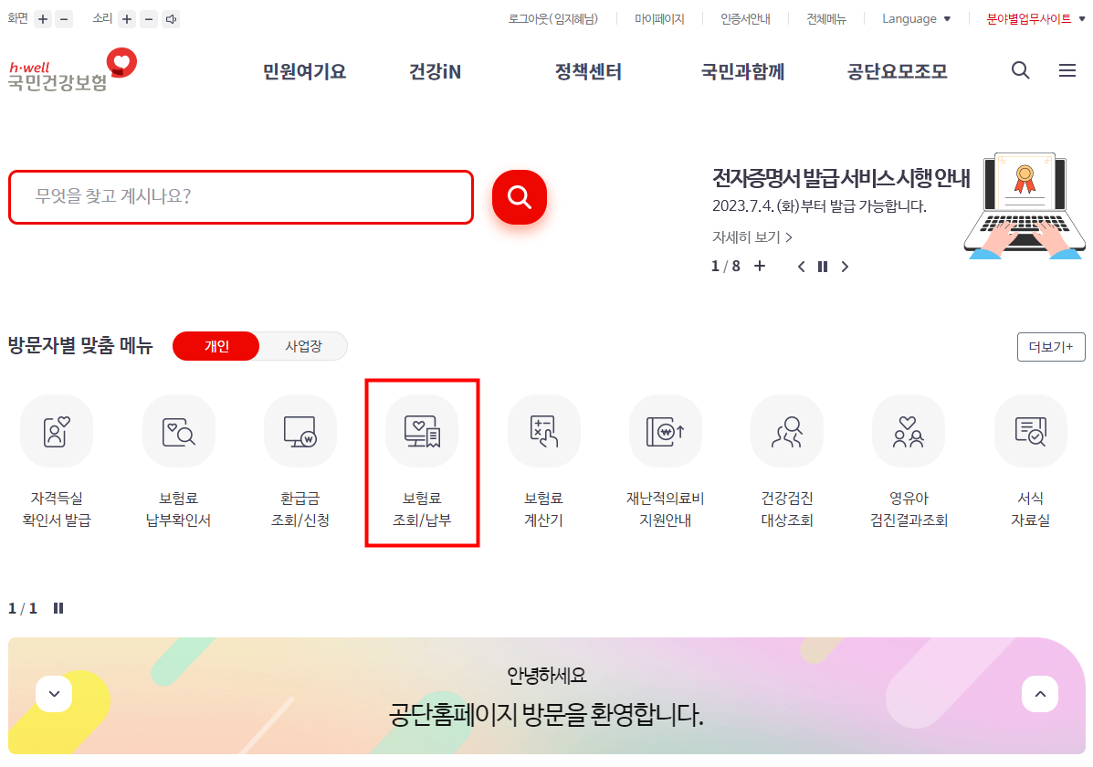 먼저 공동인증서를 통해 로그인을 한 후 중앙에 있는 메뉴 중 '보험료 조회/납부'를 클릭합니다.