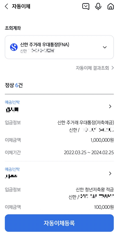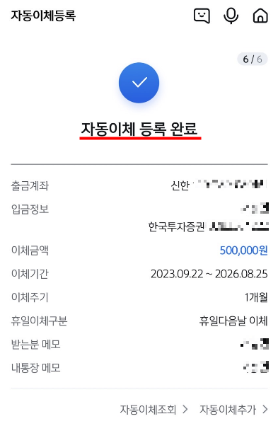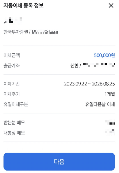 이 화면에서는 매 달 몇 일날 이체할 것인지에 대한 항목은 안보이는데, 보통 자동이체 시작일로 설정한 날이 매달 자동이체 되는 날이라고 보시면 됩니다. 위 화면에서는 2023년 9월 22일부터이니 매달 22일에 이체가 된다고 보시면 됩니다.
