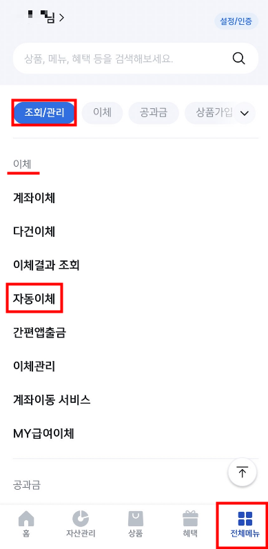 이후 조회/관리 > 이체 > 자동이체 메뉴로 접근합니다.