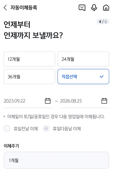 자동이체를 언제동안 할 것인지, 그리고 이체주기는 얼마로 할 것인지를 지정할 수 있습니다.