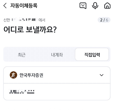 기본적으로 내가 최근에 거래한 계좌목록이 나오지만 여기에 없다면 '직접입력'을 통해서 금융사와 계좌번호를 직접 입력할 수 있습니다. 저의 경우 연금저축계좌에 정기적으로 이체할 돈이라 한국투자증권을 선택했습니다.