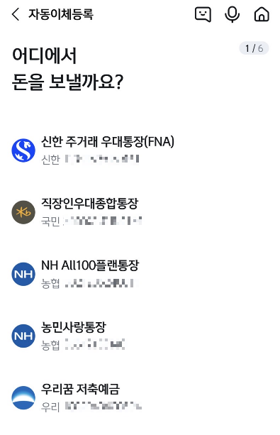 가장 먼저 어떤 계좌에서 돈이 빠져나가도록 할 것이냐를 정해줘야 하는데요. 아래 화면처럼 내 계좌로 등록된 계좌목록에서 선택하면 됩니다.