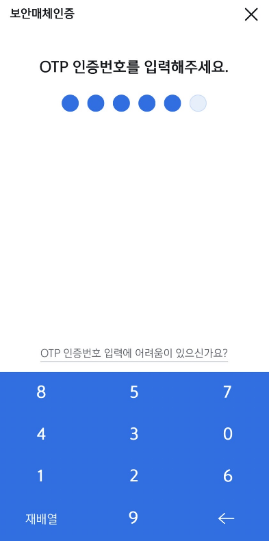 마지막으로 OTP 인증을 통해 최종적으로 자동이체 설정을 마무리합니다.