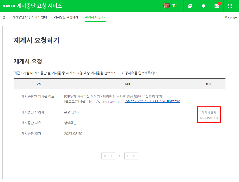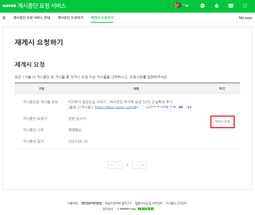 그렇게 이의신청을 하게 되면 아래 화면처럼 게시중단 요청 서비스 페이지로 가 '재게시 요청하기'를 하게 됩니다.