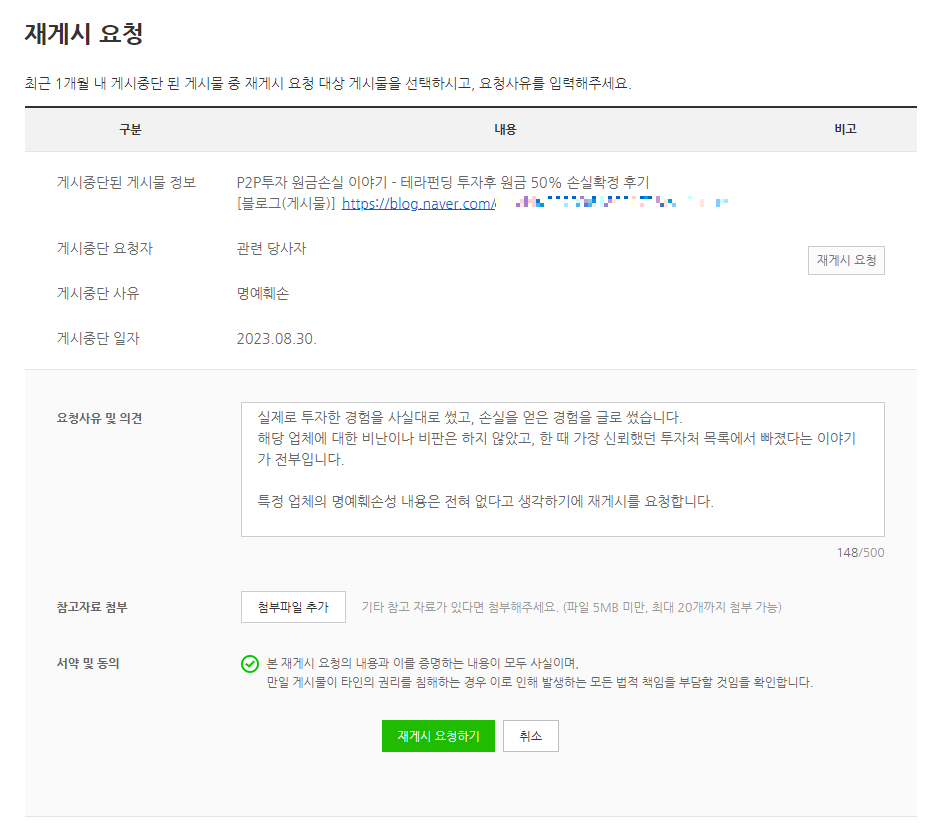 그러면 재게시를 요청하는 사유 및 의견을 상세하게 기재할 수 있습니다. 소명 단계에서 참고할 서류나 자료가 있다면 첨부파일로 추가할 수도 있습니다. 마지막으로 맨 하단에 서약 및 동의를 하고 [재게시 요청하기] 버튼을 클릭하면 재게시 요청은 끝이 납니다.