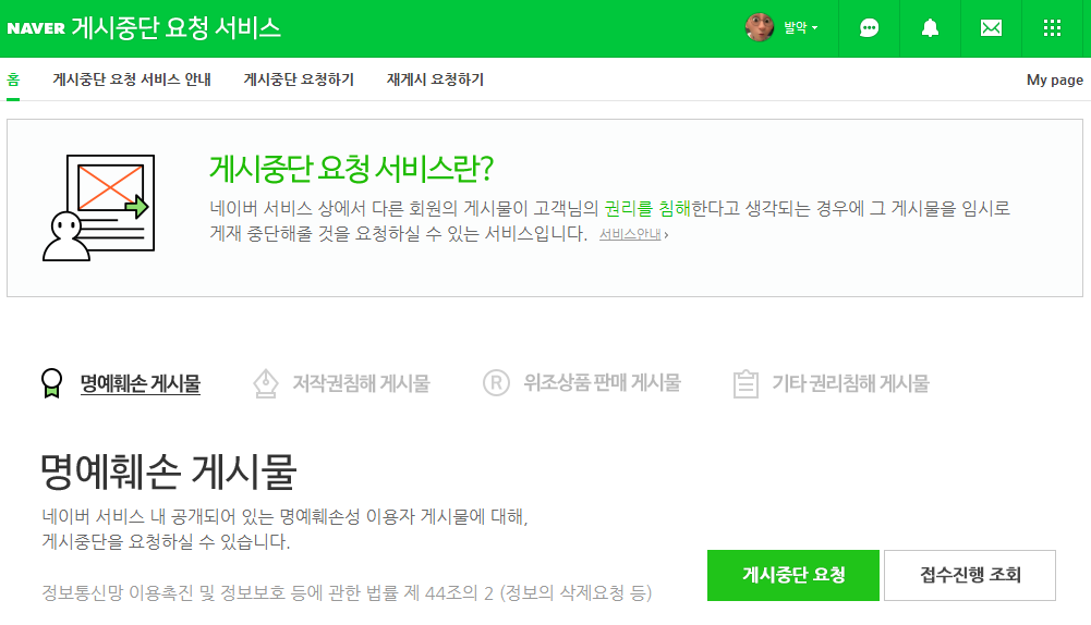 네이버 서비스 상에 있는 어떤 글이 특정인이나 단체의 권리를 침해하는 내용이 있다고 생각 될 때 침해를 받은자가 그 글의 게시를 중단을 요청할 수 있는 서비스인 것입니다.