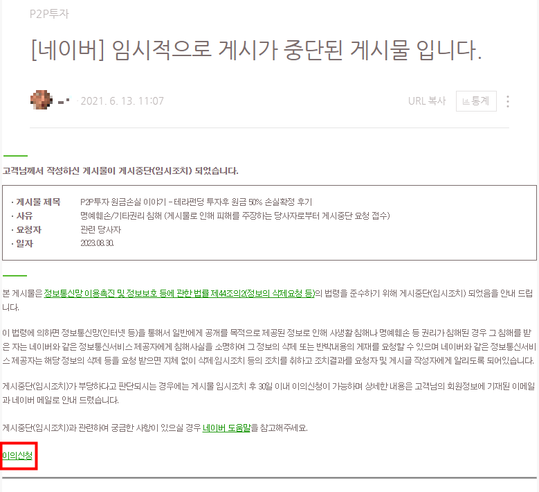게시중단 된 제 블로그 글은 2년전 P2P투자를 했다가 원금손실을 경험한 이야기를 쓴 후기였습니다. 그 내용에는 어떠한 거짓이나 과장 없이 실제로 있었던 사실만을 그대로 기재한 것인데, 그게 명예훼손으로 게시중단 됐다는게 좀 어이가 없었습니다.