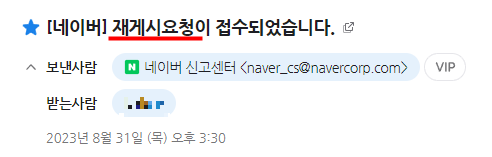 불과 2~3시간만에 네이버로부터 재게시 요청 검토결과 안내 메일이 왔고, 결국에는 재게시가 받아들여졌습니다.