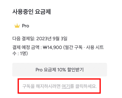 현재 내가 사용중인 요금제 상품명이 나오고 그 아래에 희미한 글씨로 "구독을 해지하시려면 여기를 클릭하세요" 라는 문장이 보입니다. 이 때 "여기" 를 클릭하면 구독해지를 할 수 있습니다.