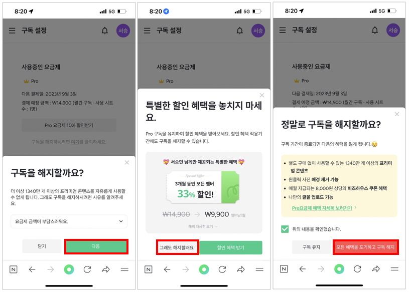 우리는 확실히 구독해지를 할 것이기에 [다음] 버튼을 누르고, [그래도 해지할래요]를 누린 뒤 다시 [모든 혜택을 포기하고 구독 해지] 버튼을 누릅니다. 절대 쫄거나 설득 당하실 필요가 없습니다.