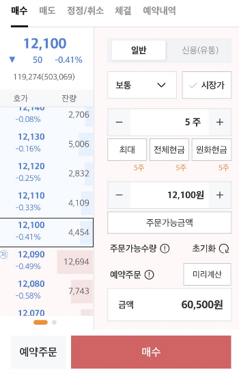 아까 봤던 호가별 물량들이 표시되고 앞서 말했듯 12,100원에 매수할거니 매수가격은 12,100원으로 설정해줍니다. 그리고 몇 주를 살 것인지 정해야 하는데 저는 5주 정도만 매수해봅니다. 12,100원 * 5주이니 총 60,500원이 들겠네요.