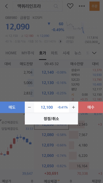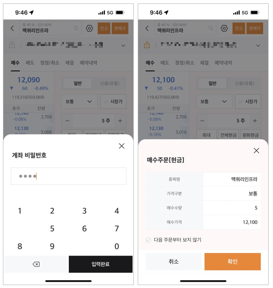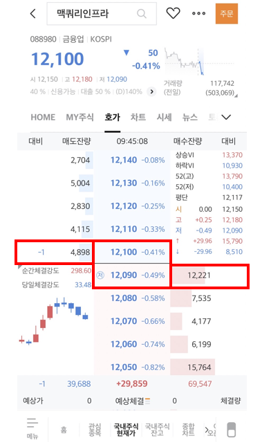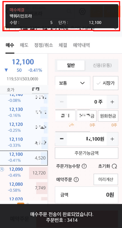 저는 일단 빨리 매수하는 것이 목적이니 바로 거래가 가능한 12,100원에 매수를 시도해봅니다.