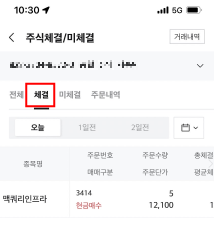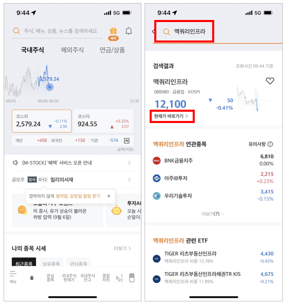 먼저 미래에셋증권앱을 실행하고 검색창에 투자할 종목을 입력해 검색합니다. 저는 맥쿼리인프라 라는 종목을 예시로 매수를 시도해보겠습니다.