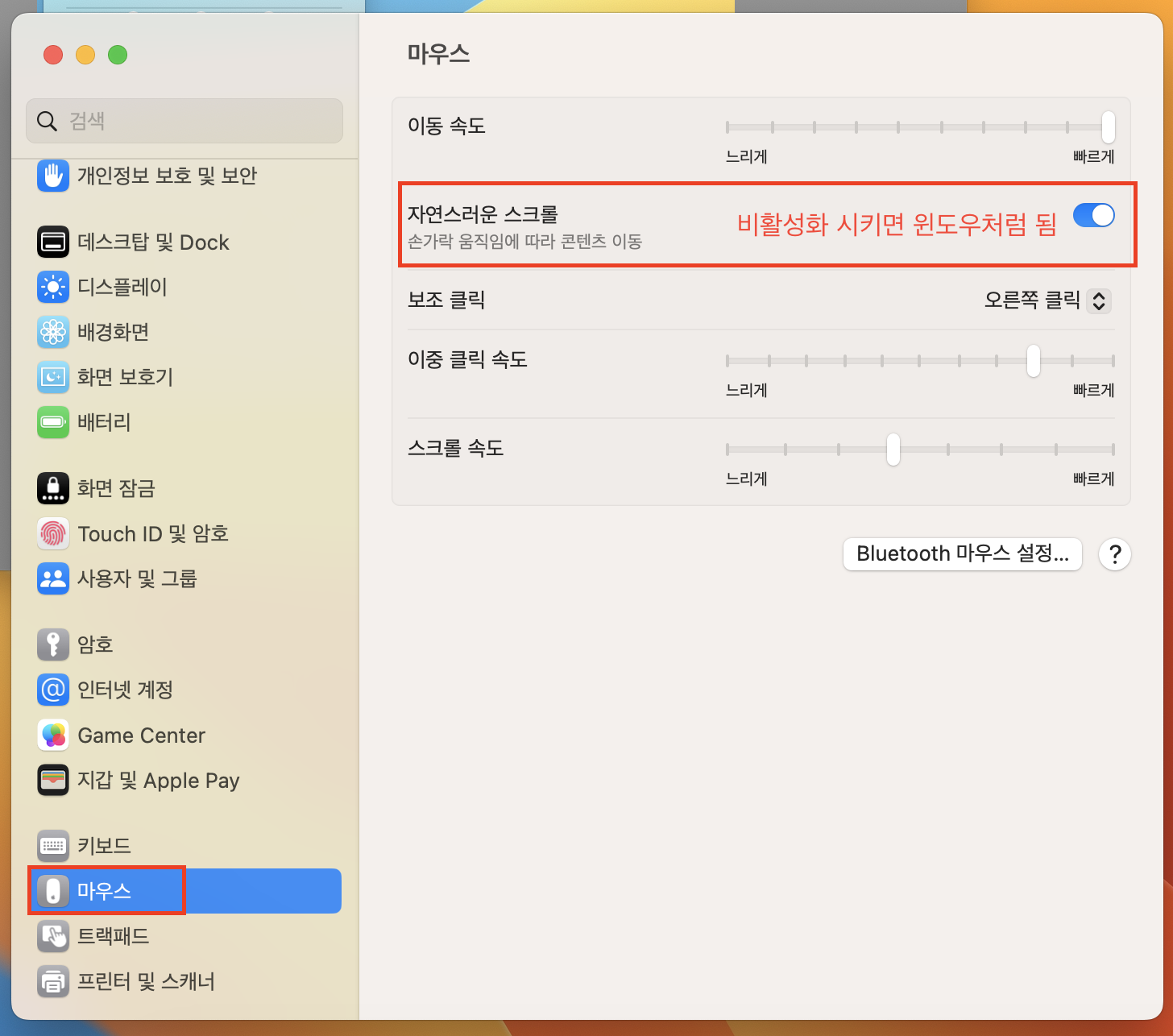 하지만 윈도우 유저들에게는 부자연스럽기 때문에 이 옵션을 비활성화 하면 윈도우처럼 스크롤을 조작할 수 있게 됩니다. 이렇게 몇 번의 클릭으로 마우스 스크롤 동작을 윈도우처럼 설정하는 작업이 끝났습니다.