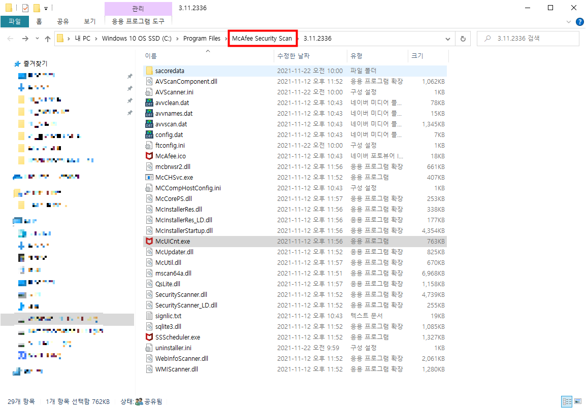 위 주소창에 McAfee Security Scan 폴더를 클릭해 상위폴더로 이동합니다.