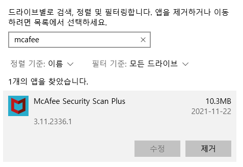 제어판을 통해 프로그램 추가/제거를 통해 제거하는 것이지요. 프로그램 이름을 McAfee 라고 검색한 후 해당 프로그램을 찾아 [제거] 버튼을 눌러 제거해주면 됩니다.