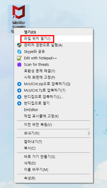 일단 McAfee 아이콘을 실행하기에 앞서 마우스 우클릭을 한 후 '파일 위치 열기'를 클릭합니다.